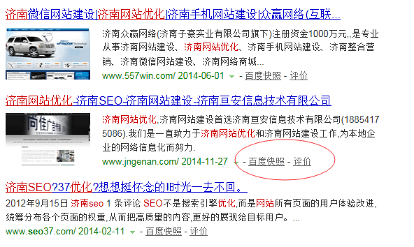 細(xì)心的用戶應(yīng)該會(huì)觀察到,百度檢索結(jié)果里,除了站點(diǎn)標(biāo)題和基本描述外,"百度快照"字樣后面還多了"評(píng)價(jià)"二字,如下圖所示: