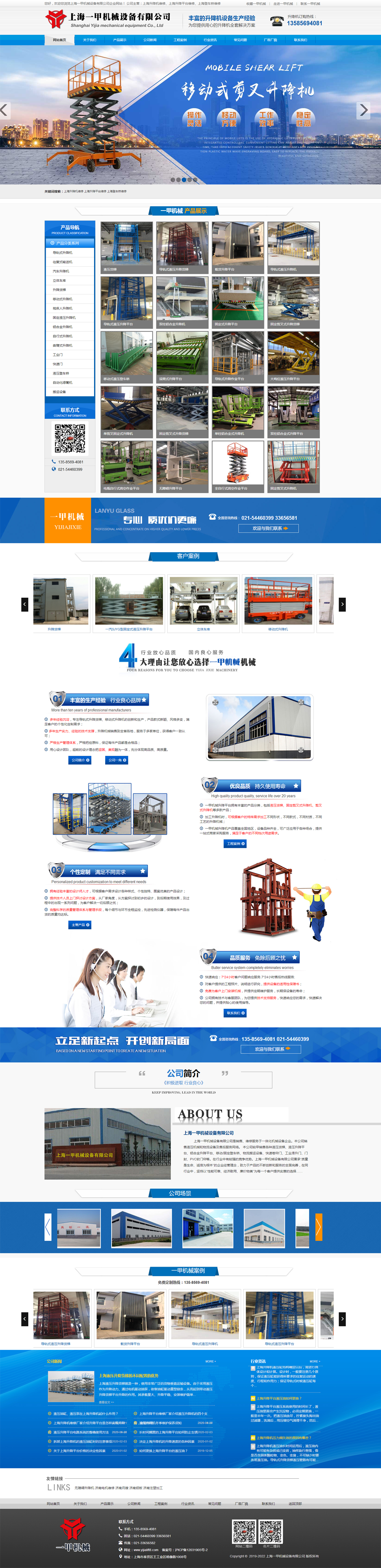 上海一甲機(jī)械設(shè)備有限公司生產(chǎn)的固定式液壓升降機(jī)、導(dǎo)軌式液壓升降機(jī)、鋁合金液壓升降機(jī)、移動(dòng)式液壓升降機(jī)等產(chǎn)品具有設(shè)計(jì)新穎、結(jié)構(gòu)合理、升降平穩(wěn)、載重安全、操作簡(jiǎn)單、維護(hù)方便等優(yōu)點(diǎn),均受到國(guó)內(nèi)眾多領(lǐng)域新老客戶的好評(píng)。產(chǎn)品共有八大系列六十多個(gè)品種,廣泛應(yīng)用于建筑裝修領(lǐng)域、企業(yè)生產(chǎn)、體育休閑場(chǎng)館、機(jī)械設(shè)備維修、軍用、高空設(shè)備安裝、機(jī)場(chǎng)、車站、港口、倉(cāng)庫(kù)等領(lǐng)域。